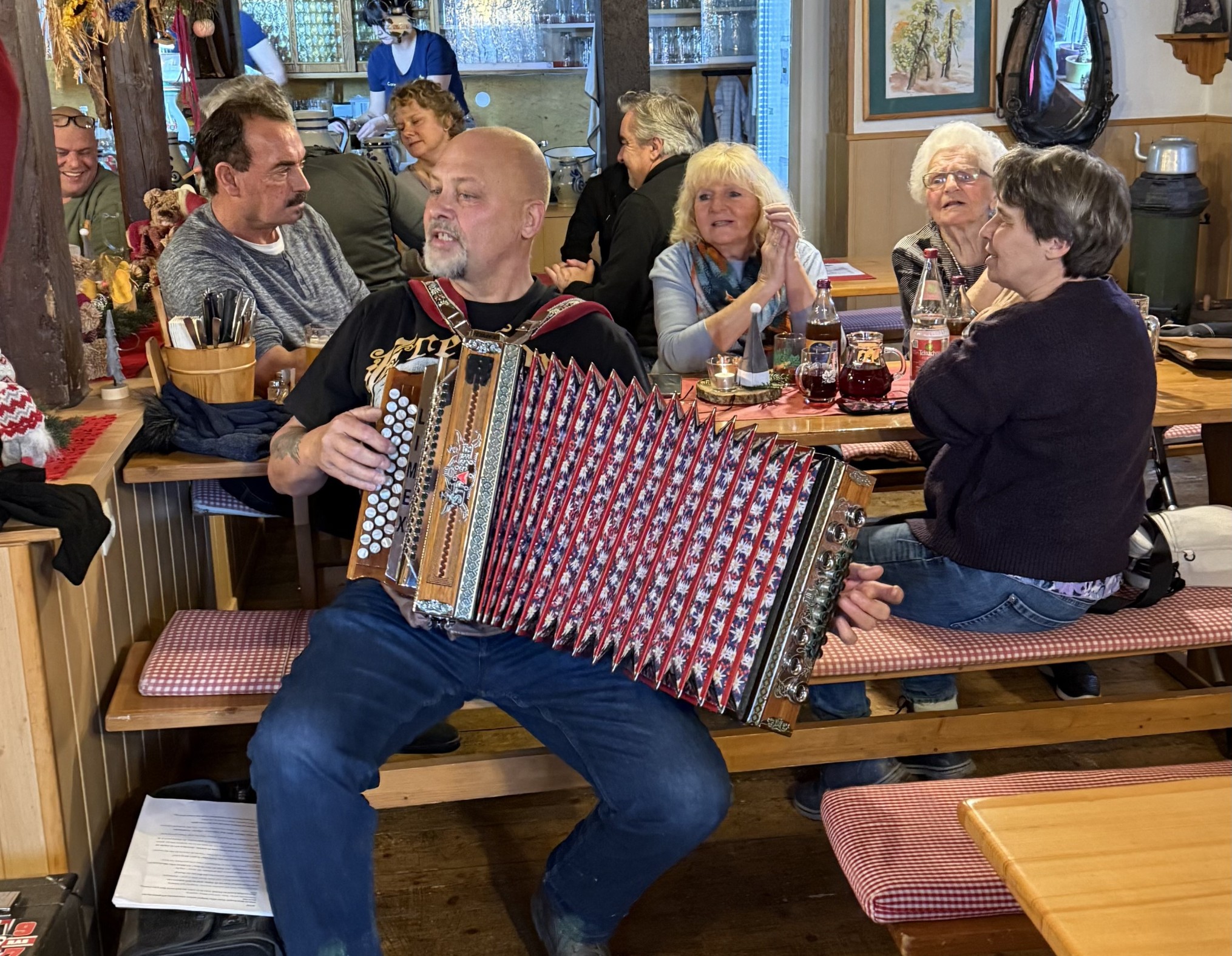 Anschließend ging es bei schönem Wetter durch den Wald zuerst allerdings ein bisschen bergauf. Nach 1,5 Stunden sind wir dann im Besen angekommen, hier wartetet bereits der Rest unserer Truppe. Insgesamt hatten sich 68 Freunde des Schwäbischen Albereins zusammen gefunden um einen schönen Nikolaus Nachmittag bei guten Essen und Getränken zu genießen. Nachdem alle ihr erstes Getränk hatten kam die 2. Überraschung. Joachim hatte seine Zwetschkommode mitgebracht und uns mit wunderschöner Musik und einigen lustigen Anekdoten unterhalten. Es war richtig klasse, danke Joachim! Auch das Team von Carina Bauer im Äpflbutza hat uns richtig verwöhnt, auch hier ein großes Lob und Danke.
